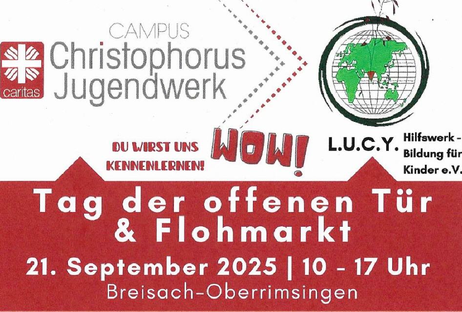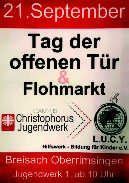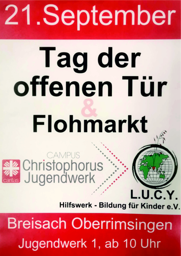 Der Erlös des Flohmarktes kommt den vielen Projekten in Indien & Afrika des L.U.C.Y. Hilfswerk – Bildung für Kinder e.V. zugute.Der Tag der offenen Tür findet auch bei schlechtem Wetter statt. Der Flohmarkt jedoch nur bei guten Wetterverhältnissen. Musikalisch umrahmt wird der Vormittag vom Musikverein Oberrimsingen. Für das leibliche Wohl sorgt die Küche des Campus Christophorus Jugendwerk.