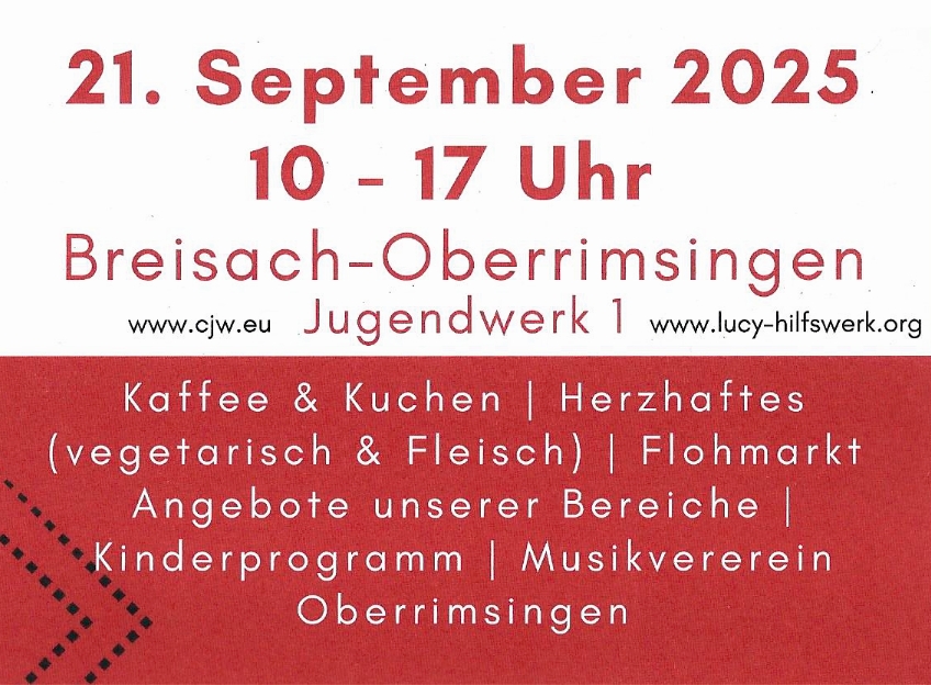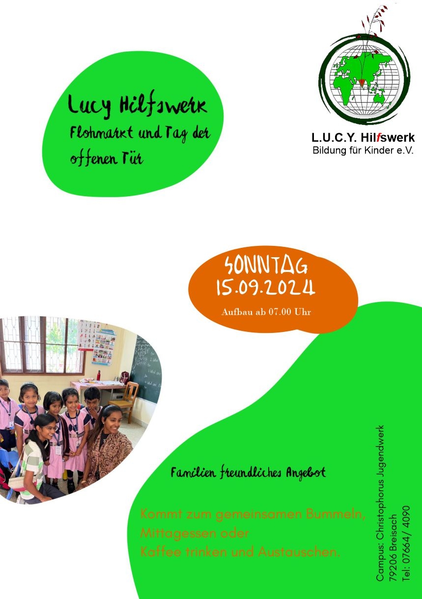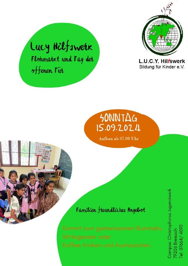 Der Erlös des Flohmarktes kommt den vielen Projekten in Indien & Afrika des L.U.C.Y. Hilfswerk – Bildung für Kinder e.V. zugute.Der Tag der offenen Tür findet auch bei schlechtem Wetter statt. Der Flohmarkt jedoch nur bei guten Wetterverhältnissen. Musikalisch umrahmt wird der Vormittag vom Musikverein Oberrimsingen. Für das leibliche Wohl sorgt die Küche des Campus Christophorus Jugendwerk.