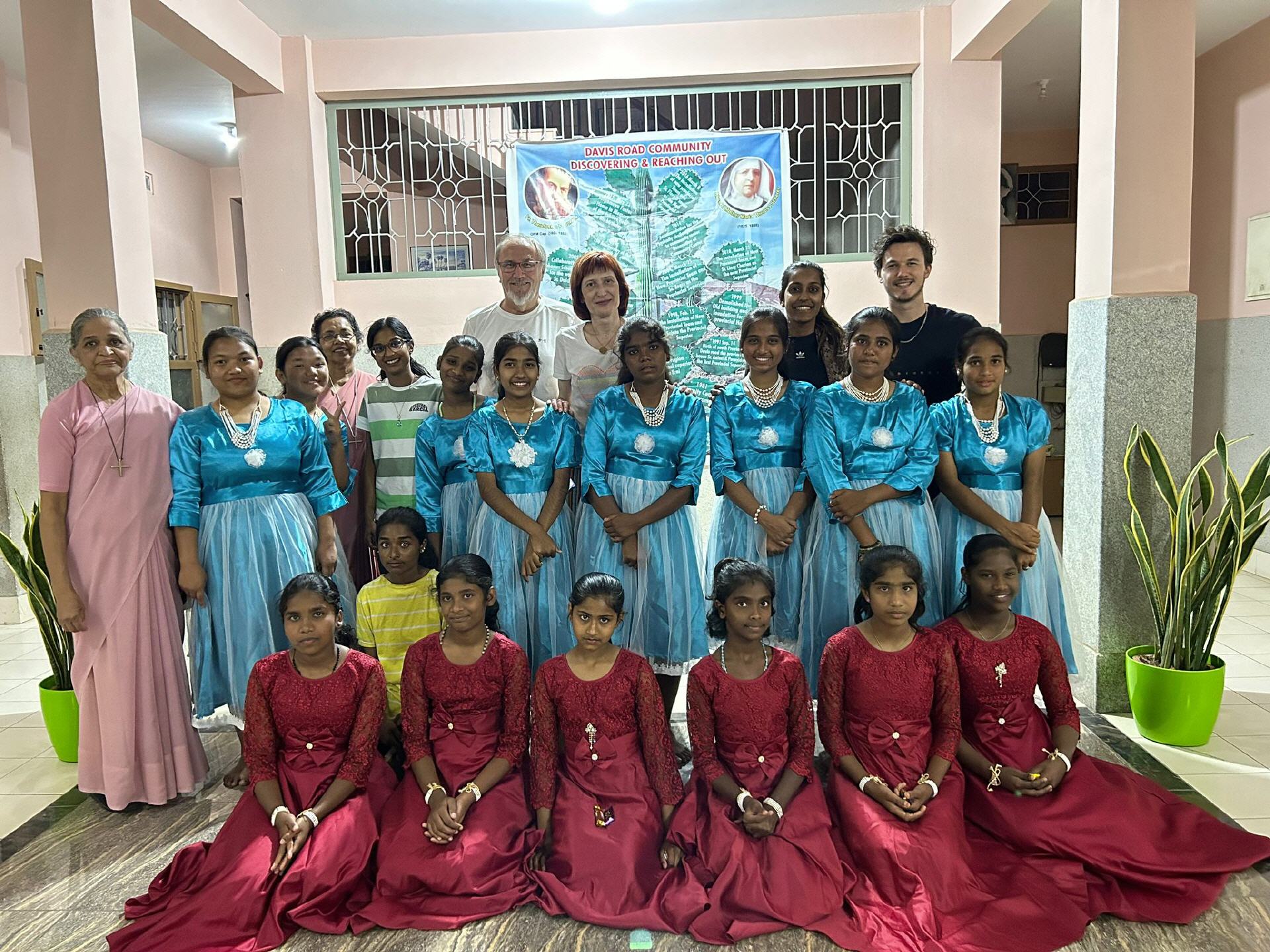 Am zweiten Standort fördern wir ein weiteres Mädchenprojekt. Im Hostel, das auf dem Gelände des Provinzhauses steht, leben weitere 16 Girls aus den Slums Bangalores, die hier schulisch und sozialpädagogisch betreut werden. Auch sie hatten ein Programm für uns mit Tänzen und Lieder bereit. Im Anschluß daran löcherten uns die Girls mit hunderten von Fragen über unsere Gewohnheiten Lieblingslieder, -Schauspieler usw.